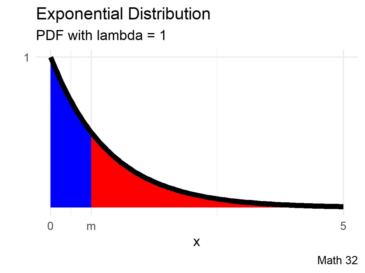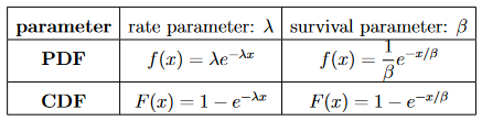 The models are related with \(\lambda = \displaystyle\frac{1}{\beta}\). Here in Math 32, we will use the model with the rate parameter \(\lambda\) (lambda) to match the convention used by the R programming language