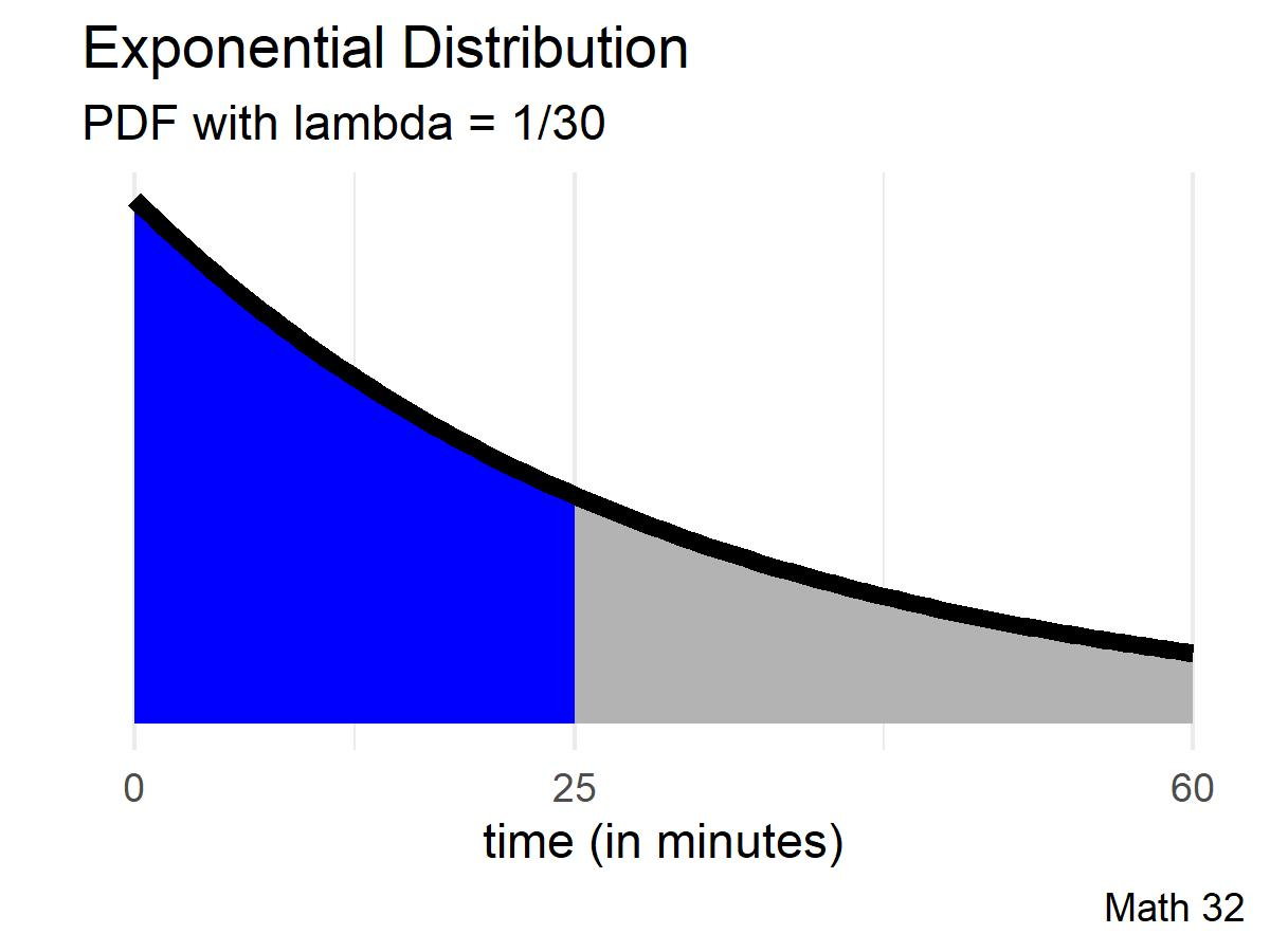 Let us now return to the notion of waiting times. Suppose that a friend of yours is going to pick you up for a carpool, and you estimate that he tends to arrive with a mean time of 30 minutes. Assume an exponential distribution.