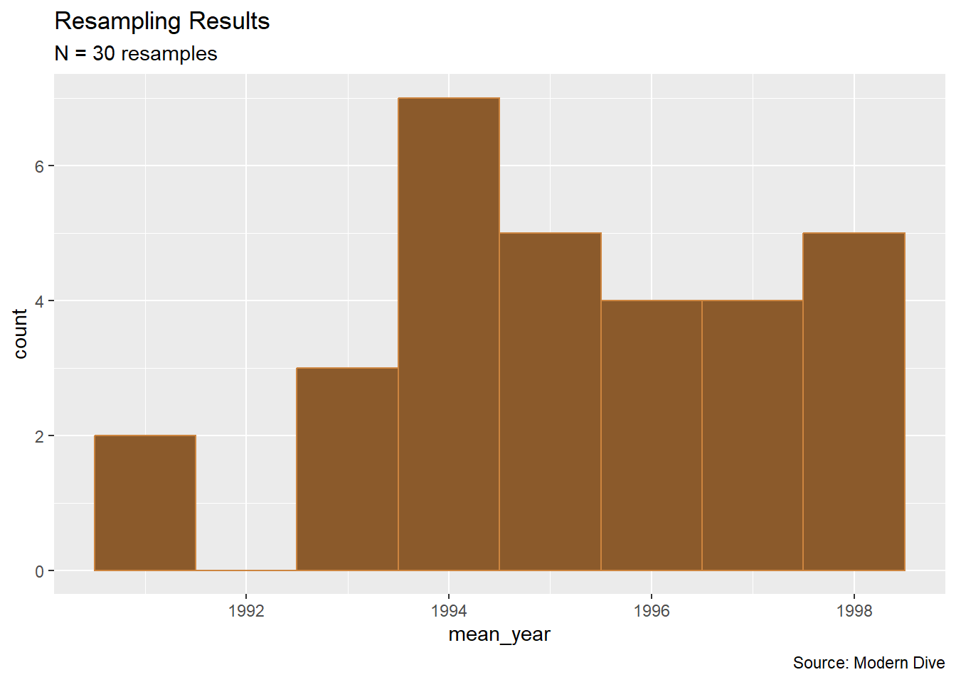 rep_sample_n(size = 50, replace = TRUE, reps = 30)Now we have each virtual student report their mean year.