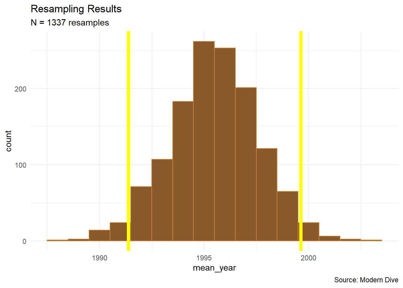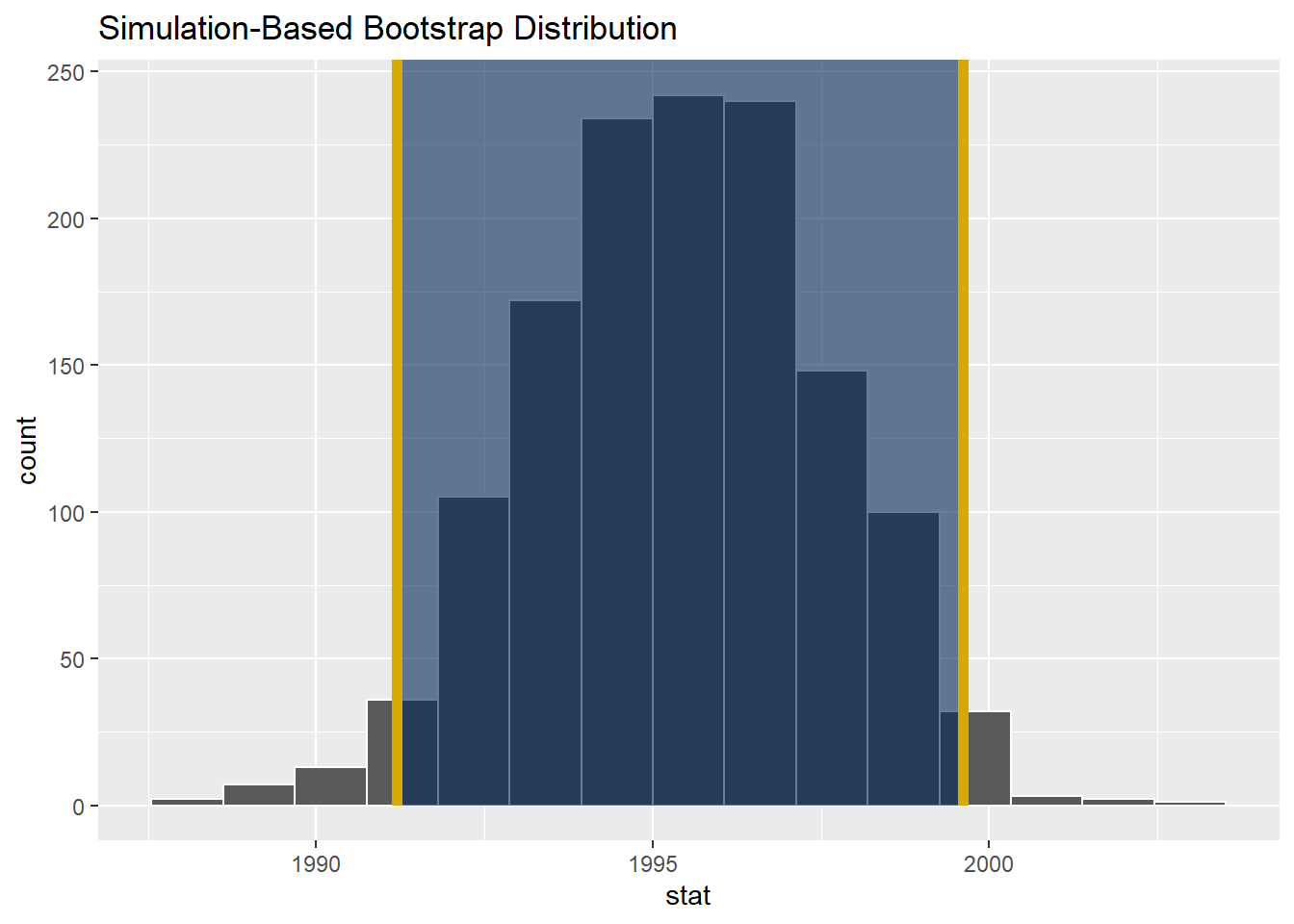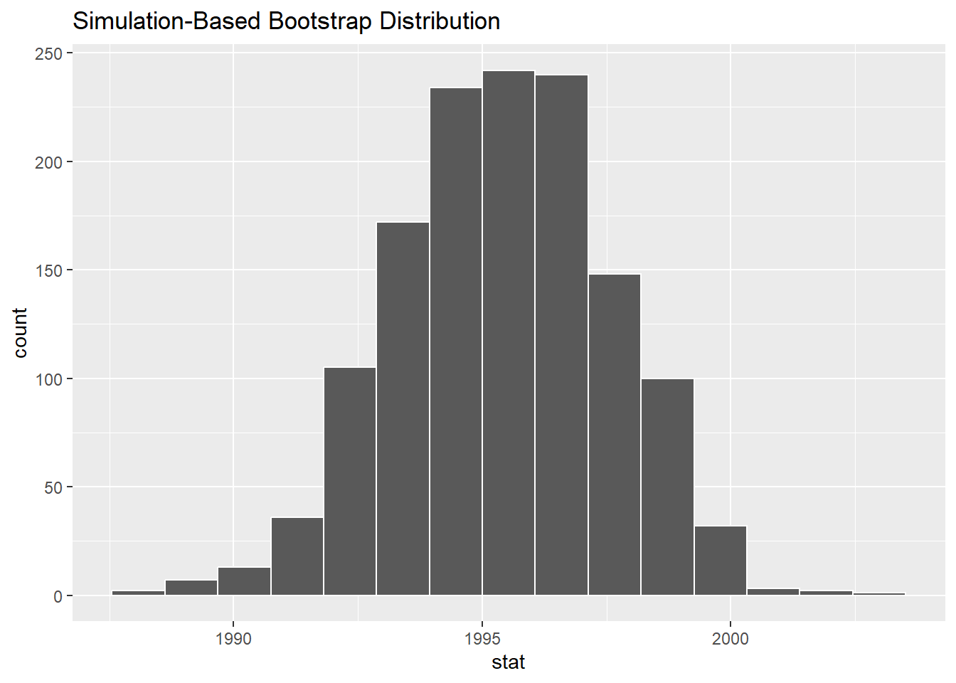 SE <- sd(pennies_resampled_means$mean_year)We can build a 95% confidence interval by computing \(\bar{x} \pm 1.96*SE\)