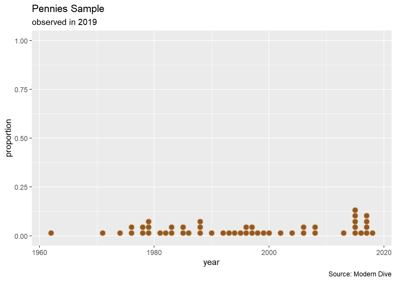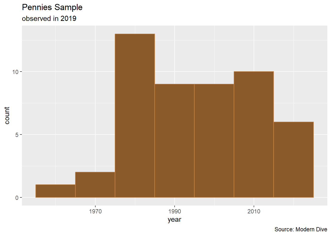 sample_n(size = 50, replace = TRUE)# visualizing the distribution of the pennies