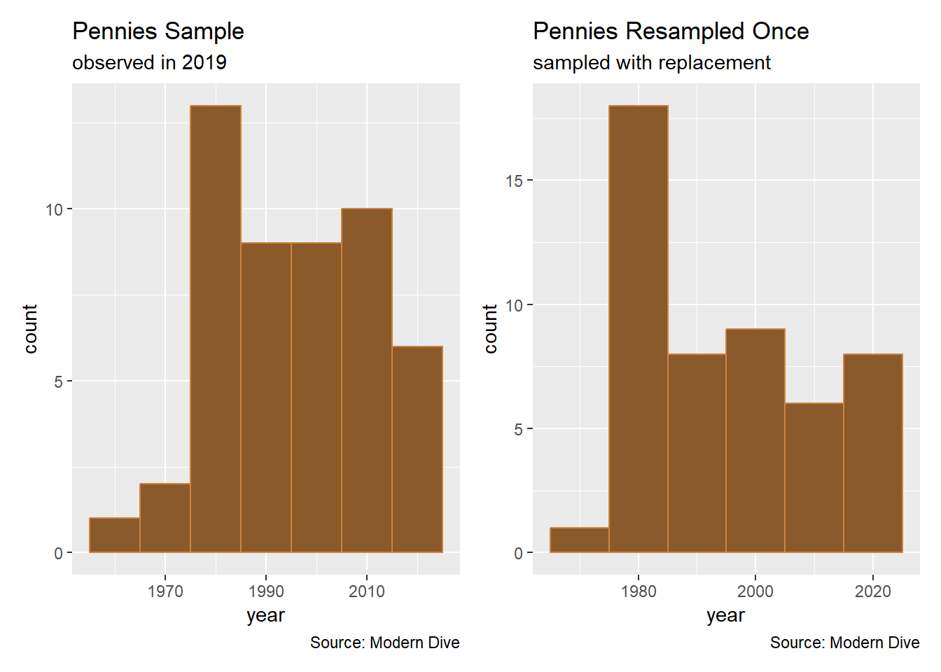 Suppose that we took the 50 pennies and resampled once while sampling with replacement.