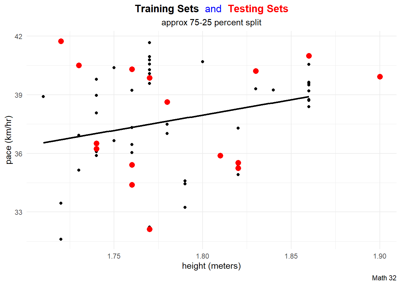 geom_point(aes(x = height, y = pace, color = "testing set"),